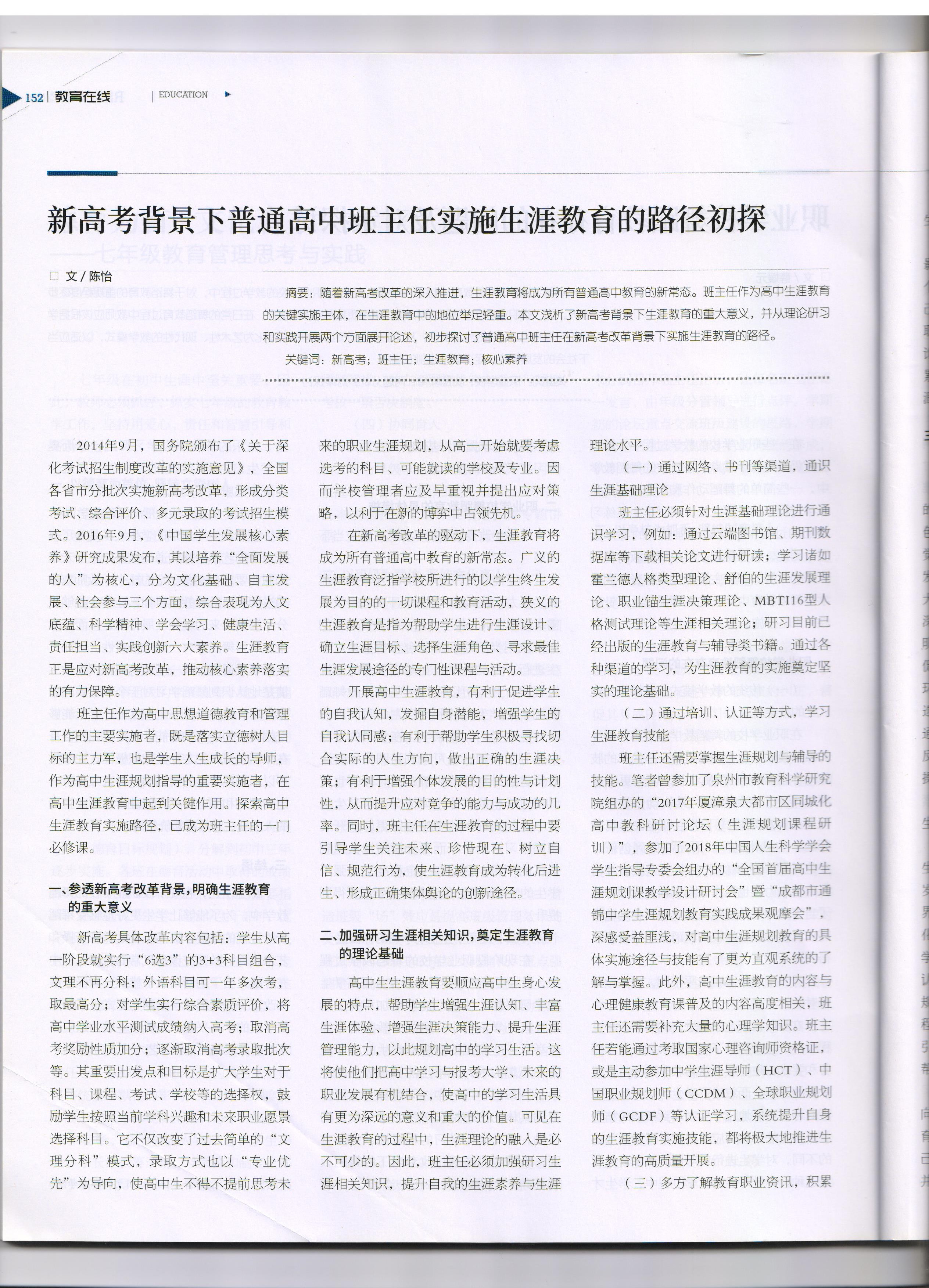 201804陈怡《新高考背景下普通高中班主任实施生涯教育的路径初探》