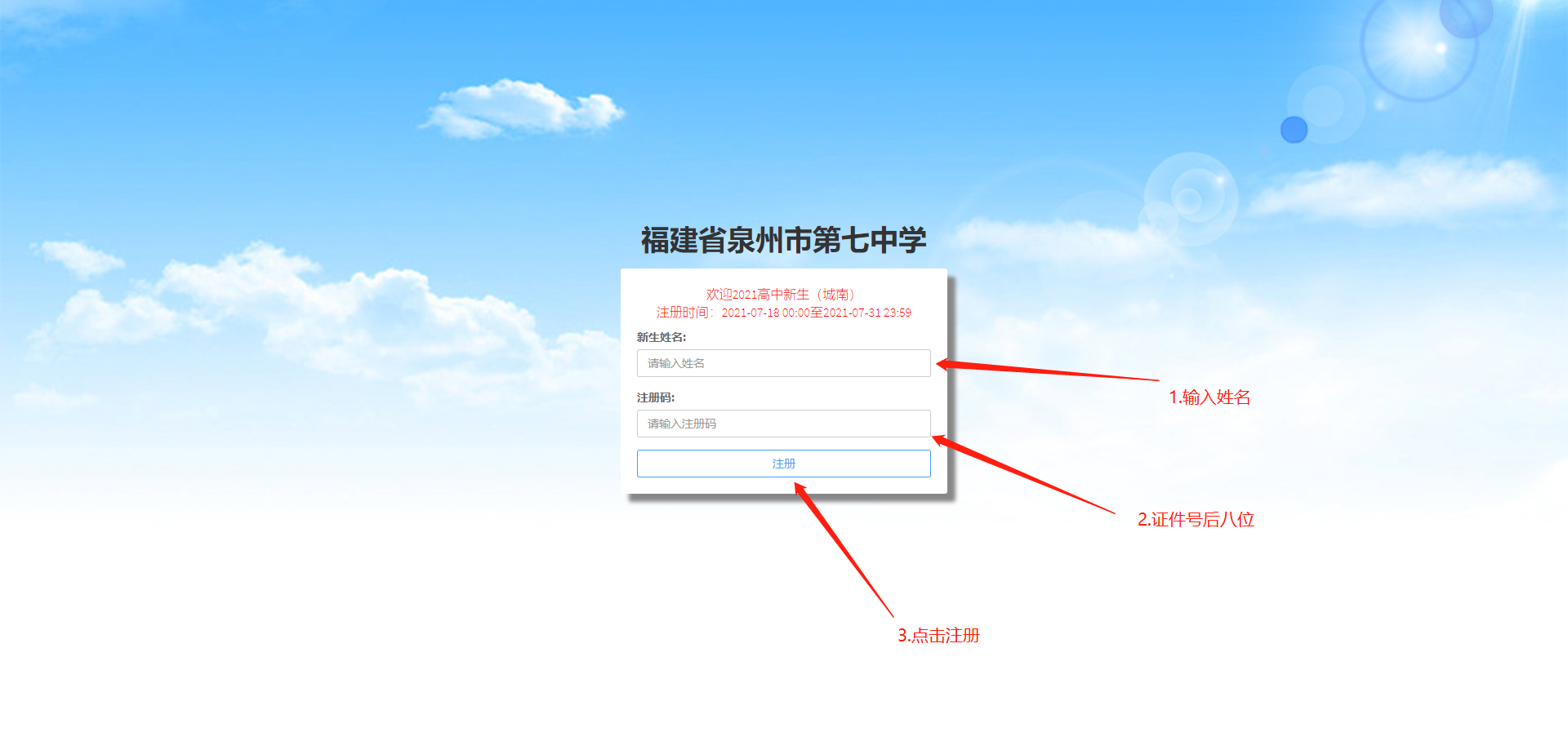 2.请于7月24日前登录泉州七中官网首页,进行网上新生注册,具体步骤为: