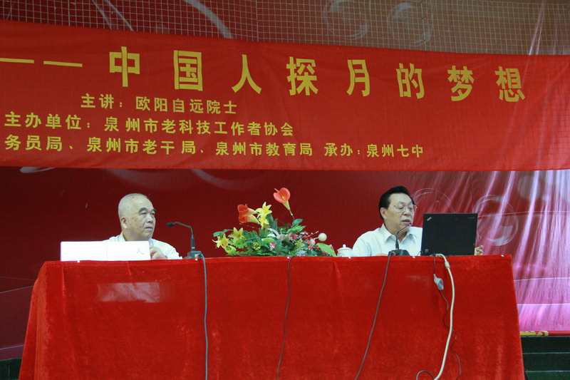 日,中国月球探测工程首席科学家,有“嫦娥之父”称的中国科学院院士欧阳自远莅临泉州七中,作题为“嫦娥工程中国人的探月梦想”的科普报告。本场报告由市老科技工作者协会主办,市公务员局、老干局、教育局联办,泉州七中协办。参加报告会的有来自市老科协成员、全市各个岗位的科学工作者和鲤城区属各学校学生约